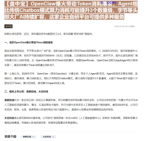CLSMA to 财联社 10合一 实时滚动更新中文 · 6 hours ago09:04【盘中宝】OpenClaw爆火带动Token消耗爆发,Agent相比传统Chatbox模式算力消耗可能提升3个数量级,字节等头部大厂AI持续扩容,这家企业自研平台可提供多种服务imagemessage-square0linkfedilinkarrow-up11arrow-down10