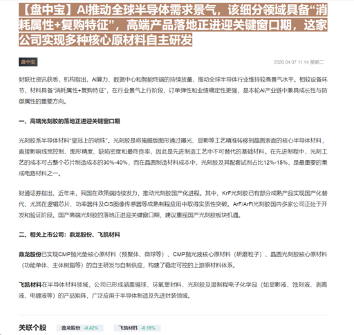 CLSMA to 财联社 10合一 实时滚动更新中文 · 6 hours ago11:14【盘中宝】AI推动全球半导体需求景气,该细分领域具备“消耗属性+复购特征”,高端产品落地正进迎关键窗口期,这家公司实现多种核心原材料自主研发imagemessage-square0linkfedilinkarrow-up11arrow-down10
