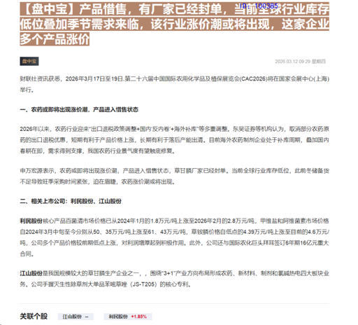 CLSMA to 财联社 10合一 实时滚动更新中文 · 7 hours ago10:22【风口研报·公司】军用耗材需求旺盛+行业供需错配+环保约束增强,这家公司核心产品市场价格已大涨160%+,同时拟新增扩建1万吨产能有望填补欧洲缺口imagemessage-square0linkfedilinkarrow-up11arrow-down10