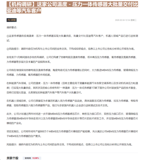 CLSMA to 财联社 10合一 实时滚动更新中文 · 10 hours ago12:54【机构调研】这家公司温度-压力一体传感器大批量交付比亚迪等汽车客户imagemessage-square0linkfedilinkarrow-up11arrow-down10