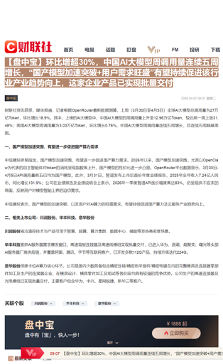 CLSMA to 财联社 10合一 实时滚动更新中文 · 6 hours ago09:07【盘中宝】环比增超30%,中国AI大模型周调用量连续五周增长,“国产模型加速突破+用户需求旺盛”有望持续促进该行业产业趋势向上,这家企业产品已实现批量交付imagemessage-square0linkfedilinkarrow-up11arrow-down10