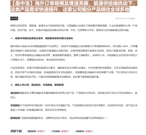 CLSMA to 财联社 10合一 实时滚动更新中文 · 6 hours ago14:26【盘中宝】海外订单规模及增速亮眼,能源供给端扰动下,这类产品需求快速提升,这家公司细分产品销往全球多地imagemessage-square0linkfedilinkarrow-up11arrow-down10