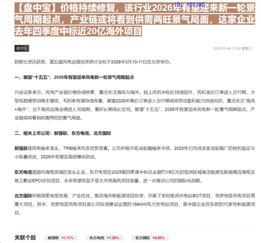 CLSMA to 财联社 10合一 实时滚动更新中文 · 8 hours ago13:50【盘中宝】价格持续修复,该行业2026年有望迎来新一轮景气周期起点,产业链或将看到供需两旺景气局面,这家企业去年四季度中标近20亿海外项目imagemessage-square0linkfedilinkarrow-up11arrow-down10