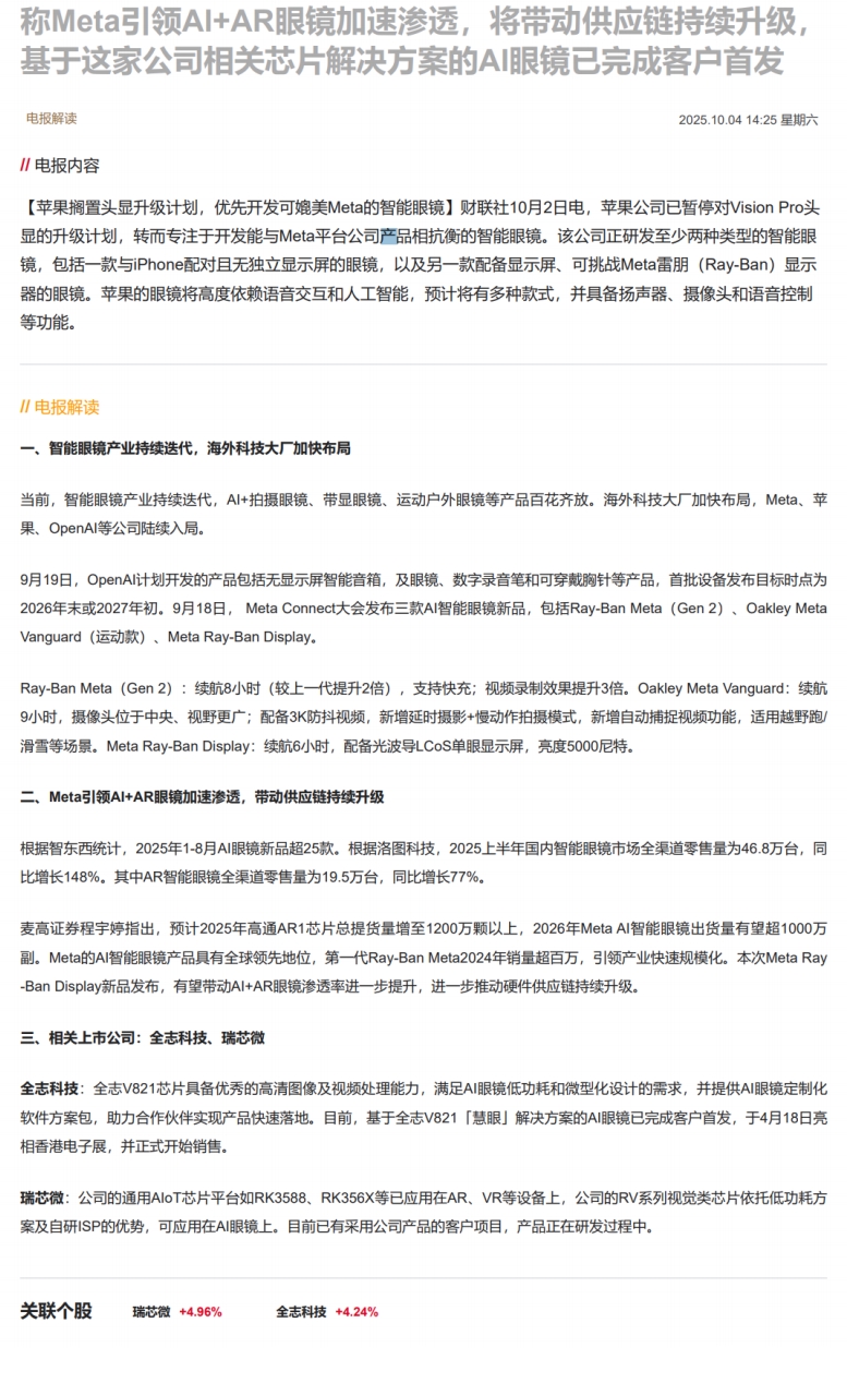 CLSMA to 财联社 10合一 实时滚动更新中文 · 12 days ago14:25【电报解读】苹果将优先开发可媲美Meta的智能眼镜!机构称Meta引领AI+AR眼镜加速渗透,将带动供应链持续升级,基于这家公司相关芯片解决方案的AI眼镜已完成客户首发imagemessage-square0linkfedilinkarrow-up11arrow-down10