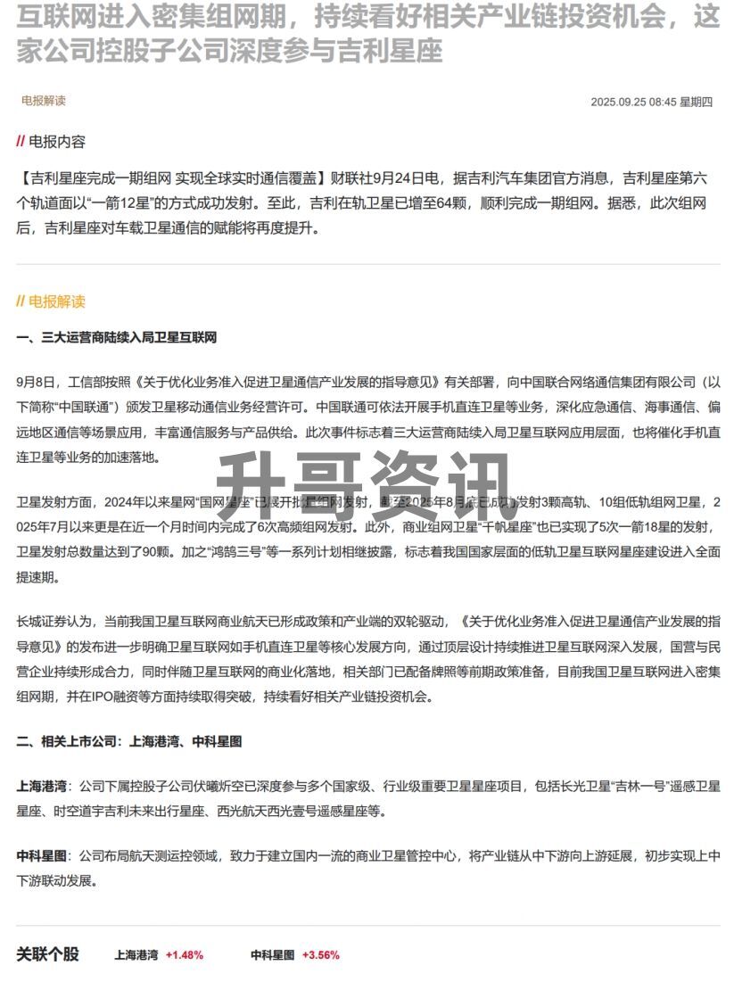 CLSMA to 财联社 10合一 实时滚动更新中文 · 25 days ago08:45【电报解读】吉利星座完成一期组网,机构称目前我国卫星互联网进入密集组网期,持续看好相关产业链投资机会,这家公司控股子公司深度参与吉利星座imagemessage-square0linkfedilinkarrow-up11arrow-down10