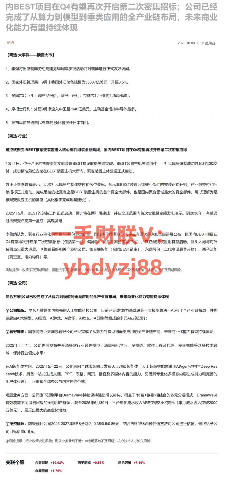 CLSMA to 财联社 10合一 实时滚动更新中文 · 11 days ago0658 【研选】BEST核聚变装置进入核心部件组装全新阶段,国内BEST项目在Q4有望再次开启第二次密集招标;公司已经完成了从算力到模型到垂类应用的全产业链布局,未来商业化能力有望持续体现imagemessage-square0linkfedilinkarrow-up11arrow-down10