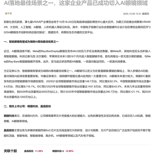 CLSMA to 财联社 10合一 实时滚动更新中文 · 11 days ago14:31【盘中宝】行业会议将召开,机构称智能眼镜有望成为端侧AI落地最佳场景之一,这家企业产品已成功切入AI眼镜领域imagemessage-square0linkfedilinkarrow-up11arrow-down10