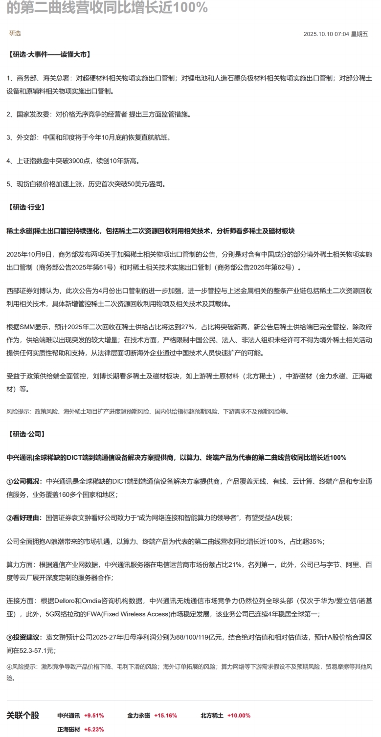 arrow-up11arrow-down1image07:04 【研选】稀土出口管控持续强化,包括稀土二次资源回收利用相关技术,分析师看多稀土及磁材板块;全球稀缺的DICT端到端通信设备解决方案提供商,以算力、终端产品为代表的第二曲线营收同比增长近100%CLSMA to 财联社 10合一 实时滚动更新中文 · 10 days agomessage-square0linkfedilink