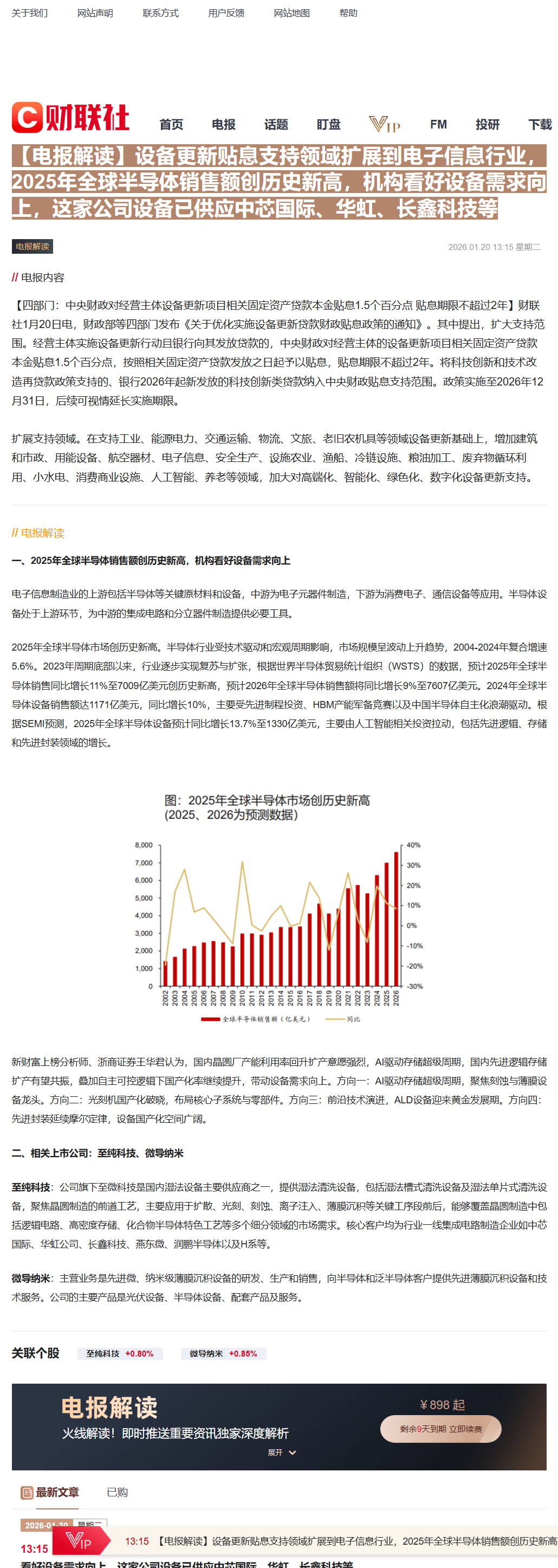 CLSMA to 财联社 10合一 实时滚动更新中文 · 23 hours ago13:15【电报解读】设备更新贴息支持领域扩展到电子信息行业,2025年全球半导体销售额创历史新高,机构看好设备需求向上,这家公司设备已供应中芯国际、华虹、长鑫科技等imagemessage-square0linkfedilinkarrow-up11arrow-down10