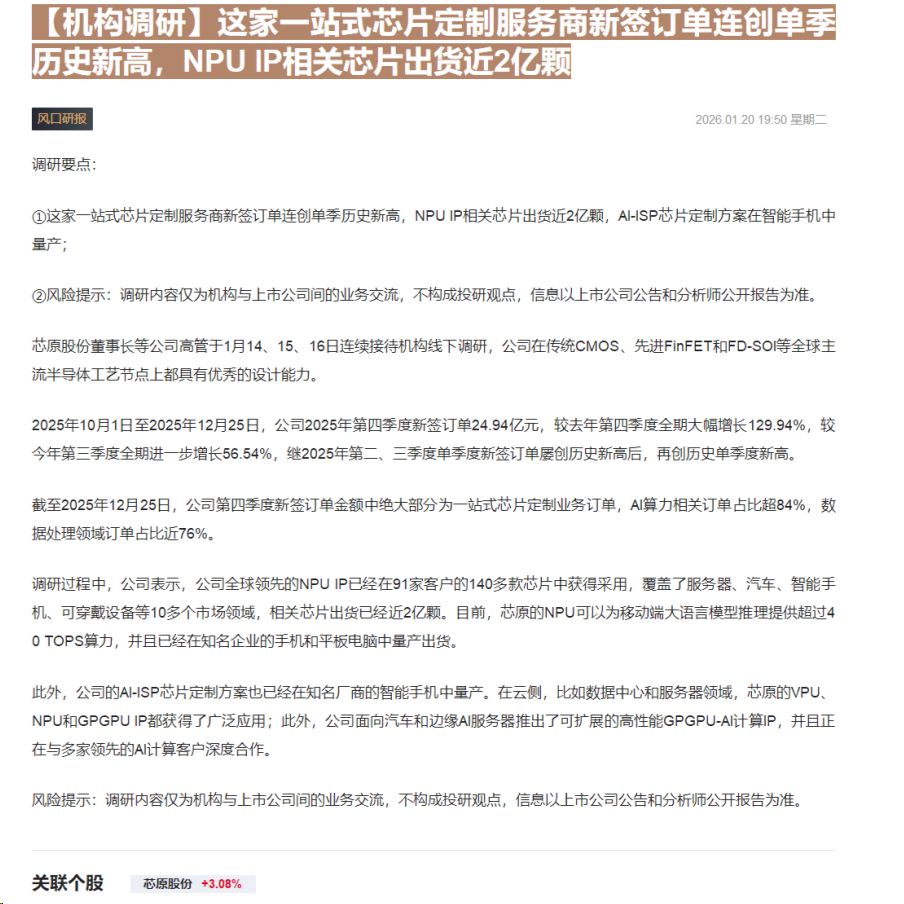CLSMA to 财联社 10合一 实时滚动更新中文 · 15 hours ago19:50【机构调研】这家一站式芯片定制服务商新签订单连创单季历史新高,NPU IP相关芯片出货近2亿颗imagemessage-square0linkfedilinkarrow-up11arrow-down10