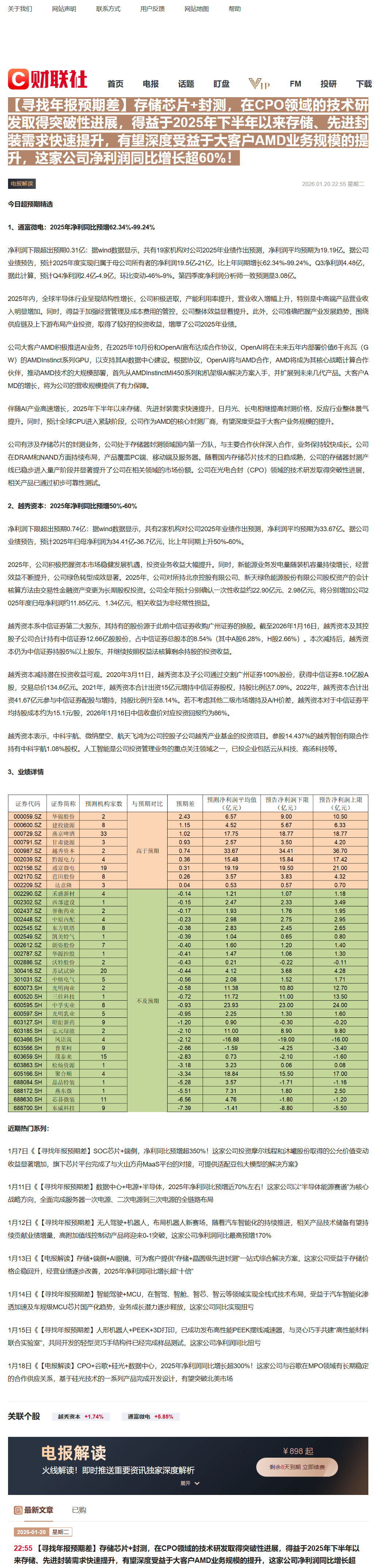 CLSMA to 财联社 10合一 实时滚动更新中文 · 12 hours ago22:55【寻找年报预期差】存储芯片+封测,在CPO领域的技术研发取得突破性进展,得益于2025年下半年以来存储、先进封装需求快速提升,有望深度受益于大客户AMD业务规模的提升,这家公司净利润同比增长超60%!imagemessage-square0linkfedilinkarrow-up11arrow-down10