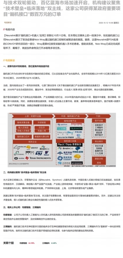 15:56【电报解读】Neuralink展示“脑机接口+机器人”应用!政策与技术双轮驱动,百亿蓝海市场加速开启,机构建议聚焦“技术壁垒+临床落地”双主线,这家公司获得某政府重要项目“脑机接口”数百万元的订单