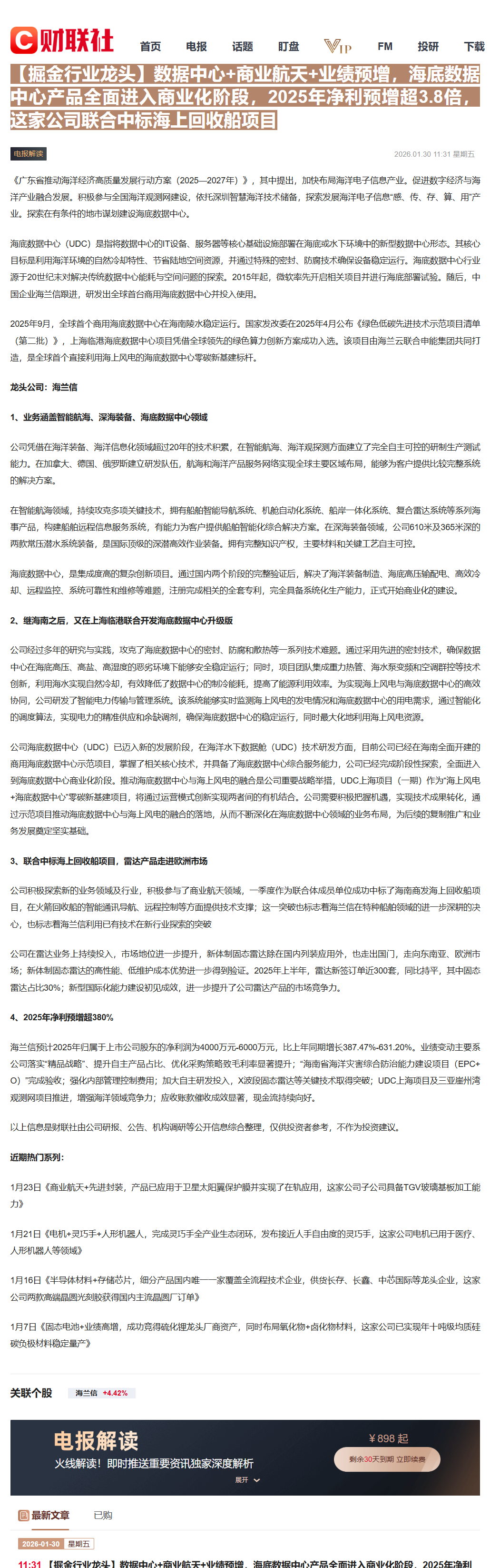CLSMA to 财联社 10合一 实时滚动更新中文 · 2 months ago11:31【掘金行业龙头】数据中心+商业航天+业绩预增,海底数据中心产品全面进入商业化阶段,2025年净利预增超3.8倍,这家公司联合中标海上回收船项目imagemessage-square0linkfedilinkarrow-up11arrow-down10