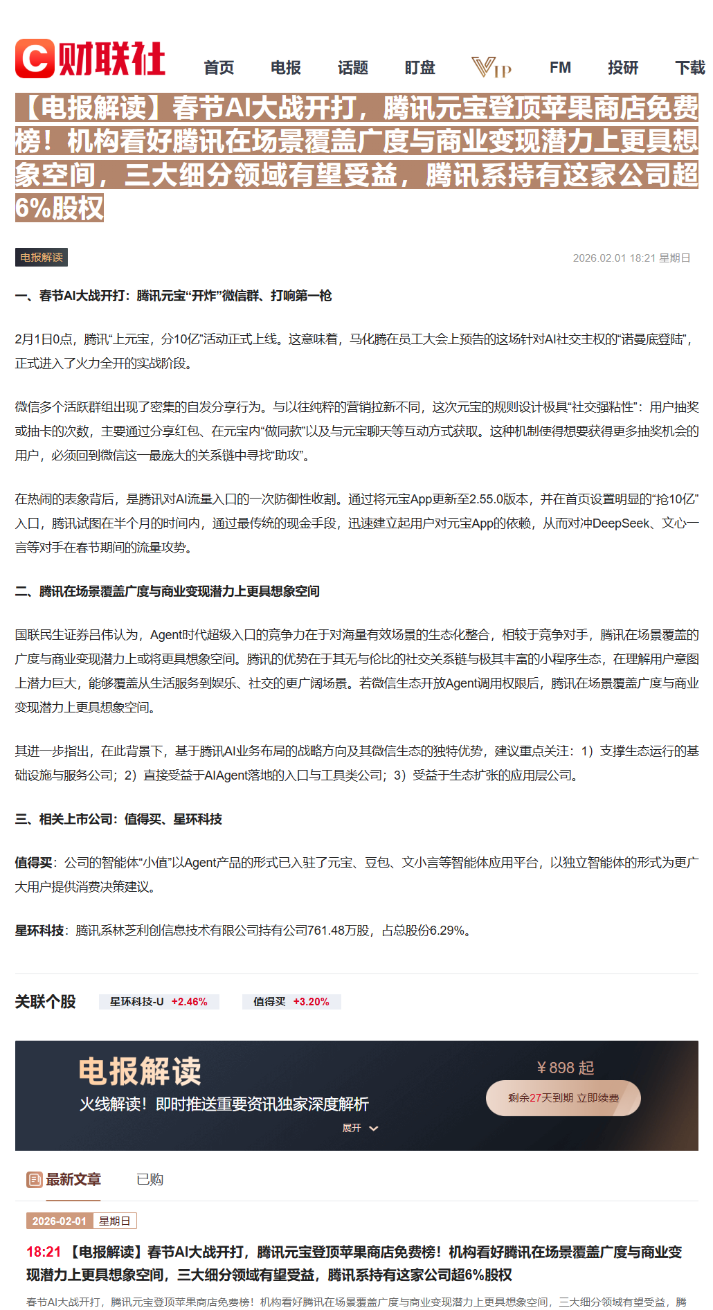 CLSMA to 财联社 10合一 实时滚动更新中文 · 29 days ago18:21【电报解读】春节AI大战开打,腾讯元宝登顶苹果商店免费榜!机构看好腾讯在场景覆盖广度与商业变现潜力上更具想象空间,三大细分领域有望受益,腾讯系持有这家公司超6%股权imagemessage-square0linkfedilinkarrow-up11arrow-down10
