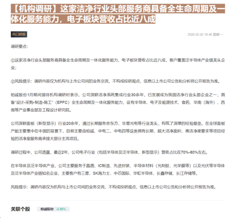 19:46【机构调研】这家洁净行业头部服务商具备全生命周期及一体化服务能力,电子板块营收占比近八成
