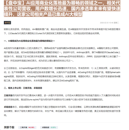 10:46【盘中宝】AI应用商业化落地最为顺畅的领域之一,相关代表性公司营收、用户数增长迅速,国内渗透率未来有望快速提升,这家公司相关产品已集成AI大模型