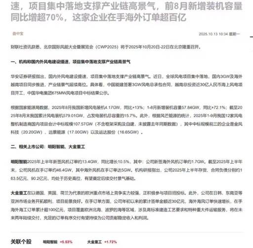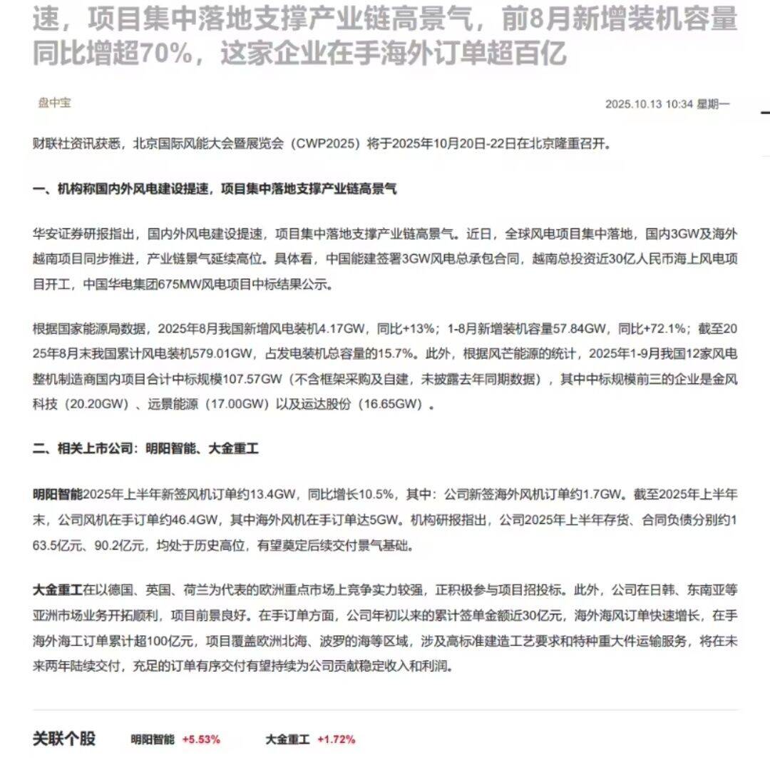 CLSMA to 财联社 10合一 实时滚动更新中文 · 7 days ago10:34 【盘中宝】行业会议将召开,机构称国内外该行业建设提速,项目集中落地支撑产业链高景气,前8月新增装机容量同比增超70%,这家企业在手海外订单超百亿imagemessage-square0linkfedilinkarrow-up11arrow-down10