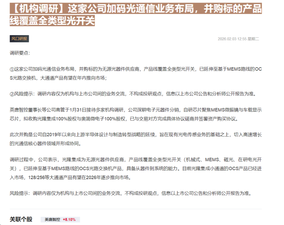 CLSMA to 财联社 10合一 实时滚动更新中文 · 28 days ago12:55【机构调研】这家公司加码光通信业务布局,并购标的产品线覆盖全类型光开关imagemessage-square0linkfedilinkarrow-up11arrow-down10