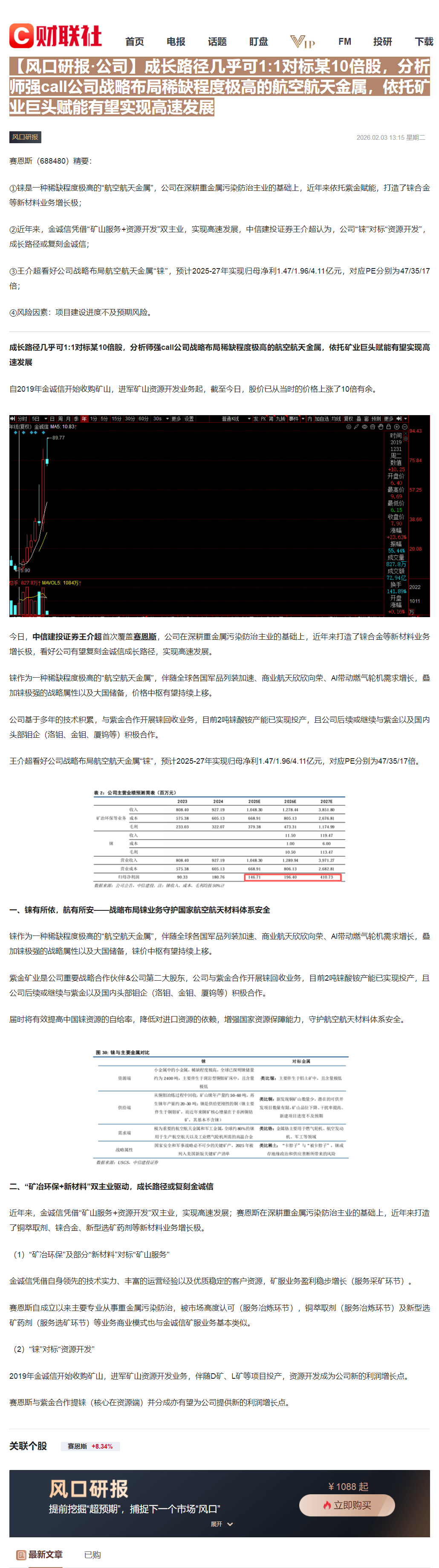 13:15【风口研报·公司】成长路径几乎可1:1对标某10倍股,分析师强call公司战略布局稀缺程度极高的航空航天金属,依托矿业巨头赋能有望实现高速发展