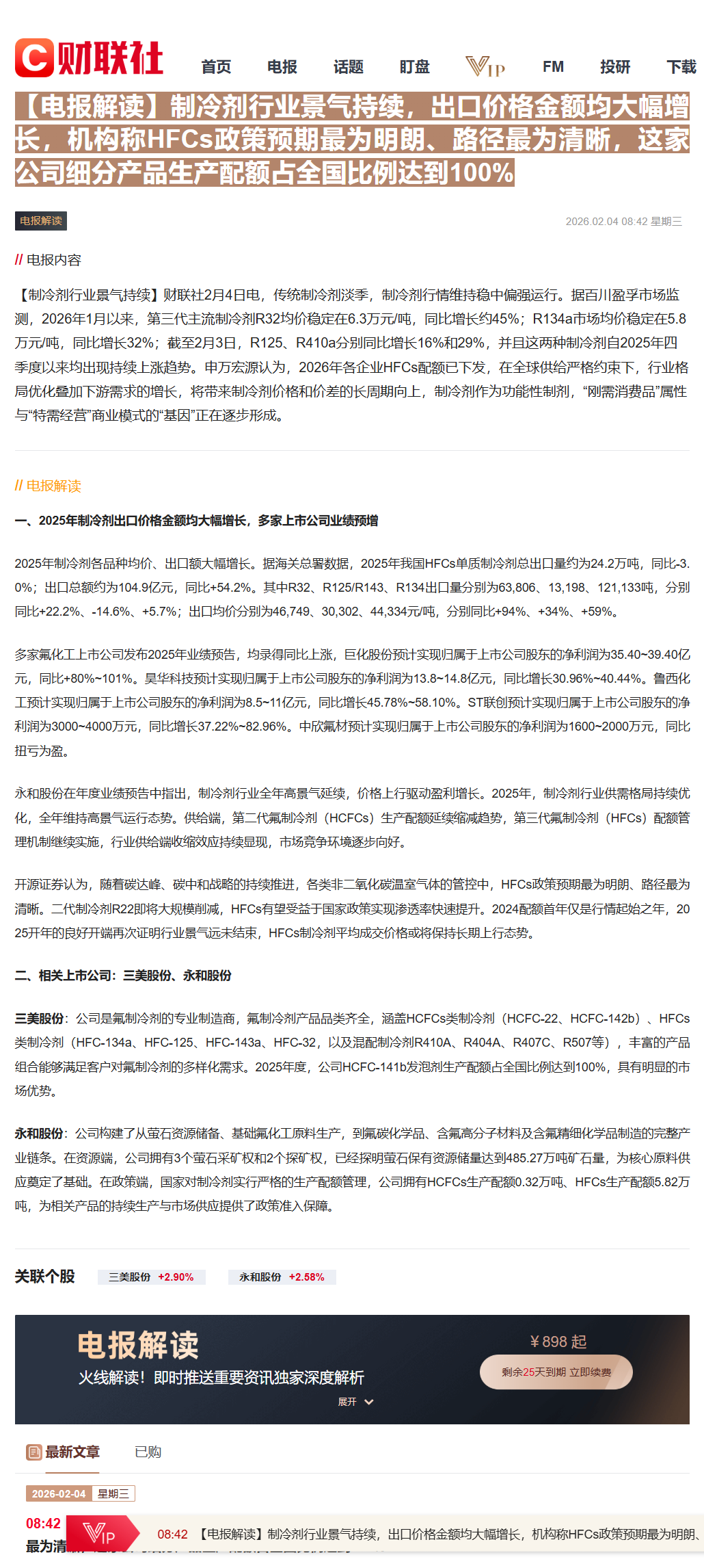 CLSMA to 财联社 10合一 实时滚动更新中文 · 14 hours ago08:42【电报解读】制冷剂行业景气持续,出口价格金额均大幅增长,机构称HFCs政策预期最为明朗、路径最为清晰,这家公司细分产品生产配额占全国比例达到100%imagemessage-square0linkfedilinkarrow-up11arrow-down10