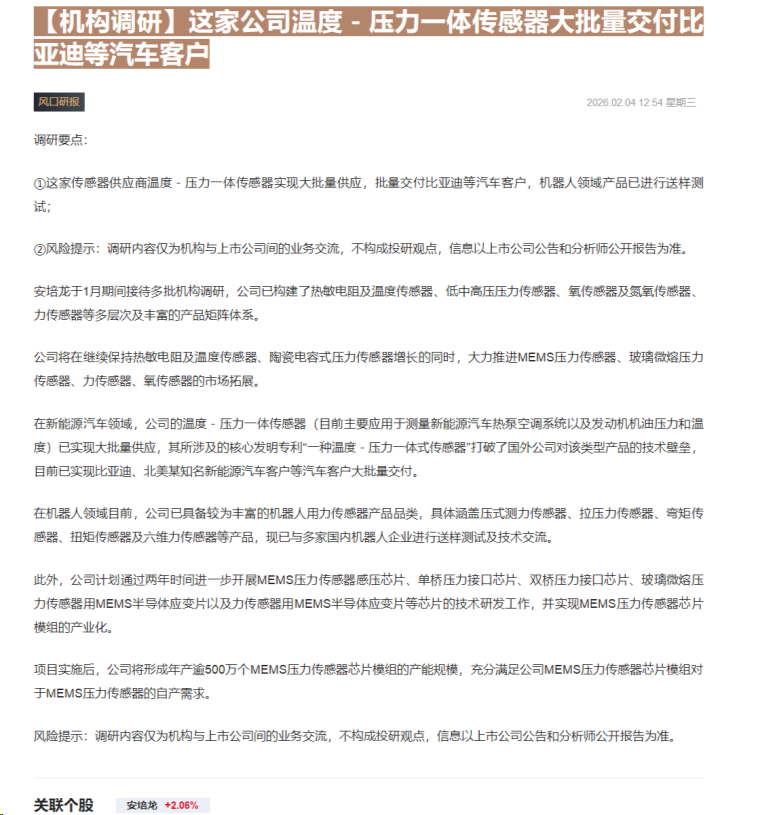 CLSMA to 财联社 10合一 实时滚动更新中文 · 12 hours ago12:54【机构调研】这家公司温度-压力一体传感器大批量交付比亚迪等汽车客户imagemessage-square0linkfedilinkarrow-up11arrow-down10
