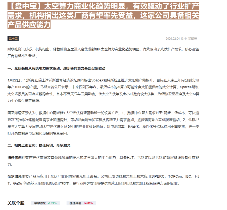 CLSMA to 财联社 10合一 实时滚动更新中文 · 15 hours ago13:44【盘中宝】太空算力商业化趋势明显,有效驱动了行业扩产需求,机构指出这类厂商有望率先受益,这家公司具备相关产品供应能力imagemessage-square0linkfedilinkarrow-up11arrow-down10