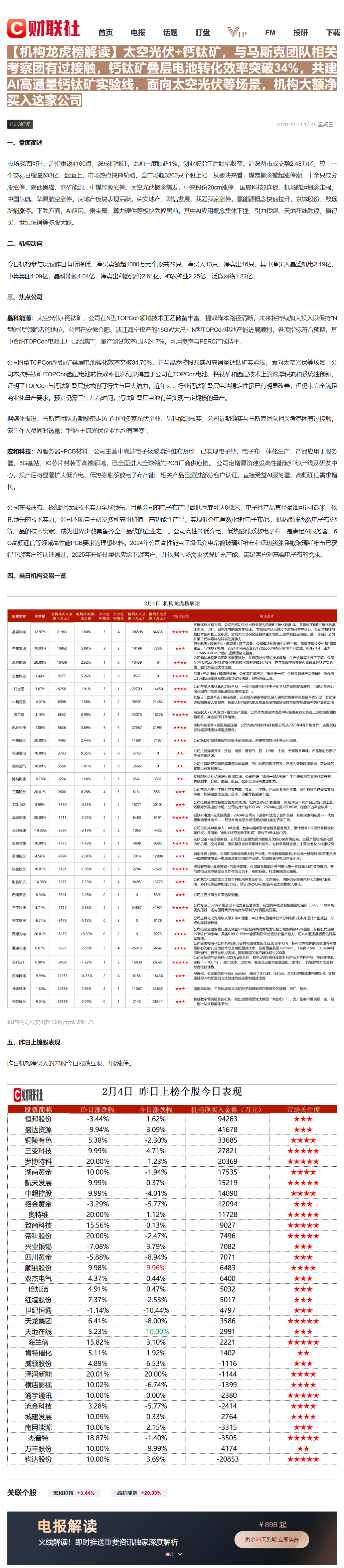 CLSMA to 财联社 10合一 实时滚动更新中文 · 12 hours ago17:49【机构龙虎榜解读】太空光伏+钙钛矿,与马斯克团队相关考察团有过接触,钙钛矿叠层电池转化效率突破34%,共建AI高通量钙钛矿实验线,面向太空光伏等场景,机构大额净买入这家公司imagemessage-square0linkfedilinkarrow-up11arrow-down10