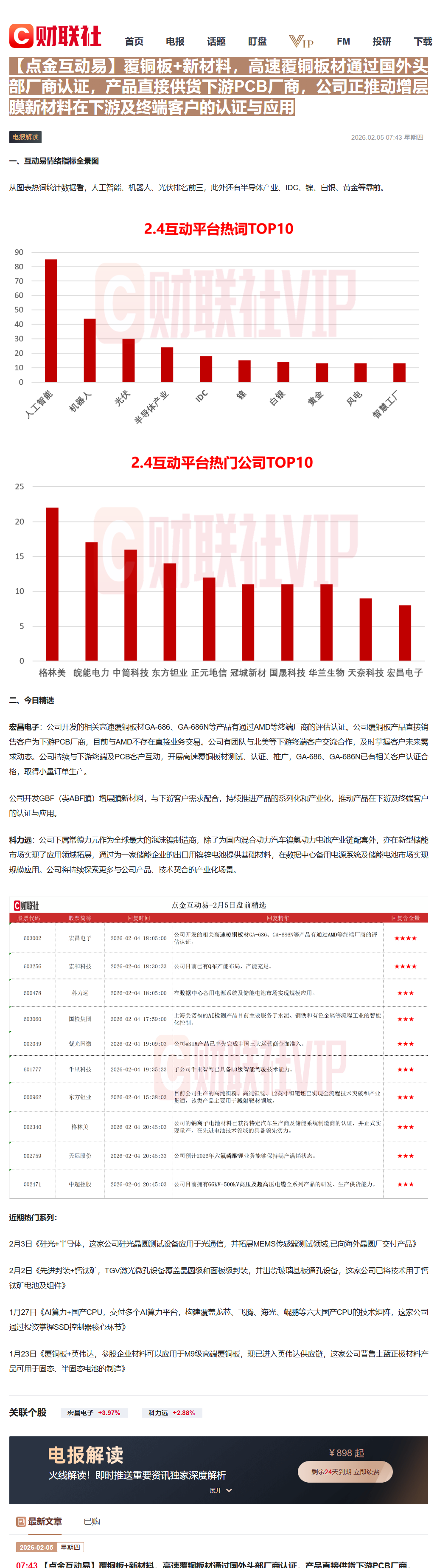 CLSMA to 财联社 10合一 实时滚动更新中文 · 22 hours ago07:43【点金互动易】覆铜板+新材料,高速覆铜板材通过国外头部厂商认证,产品直接供货下游PCB厂商,公司正推动增层膜新材料在下游及终端客户的认证与应用imagemessage-square0linkfedilinkarrow-up11arrow-down10