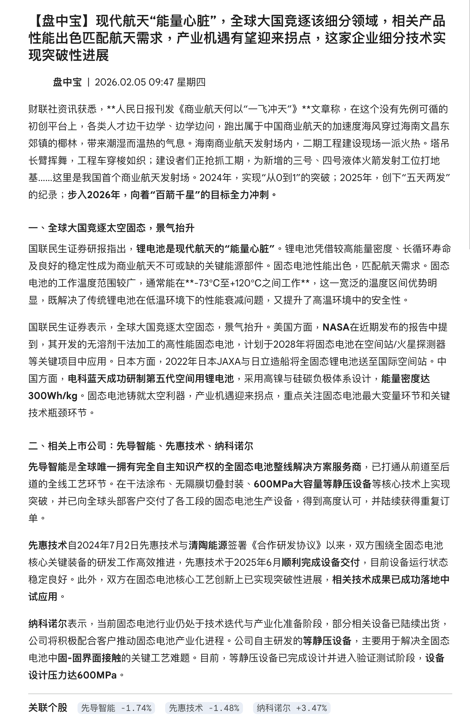 CLSMA to 财联社 10合一 实时滚动更新中文 · 20 hours ago09:47【盘中宝】现代航天“能量心脏”,全球大国竞逐该细分领域,相关产品性能出色匹配航天需求,产业机遇有望迎来拐点,这家企业细分技术实现突破性进展imagemessage-square0linkfedilinkarrow-up11arrow-down10