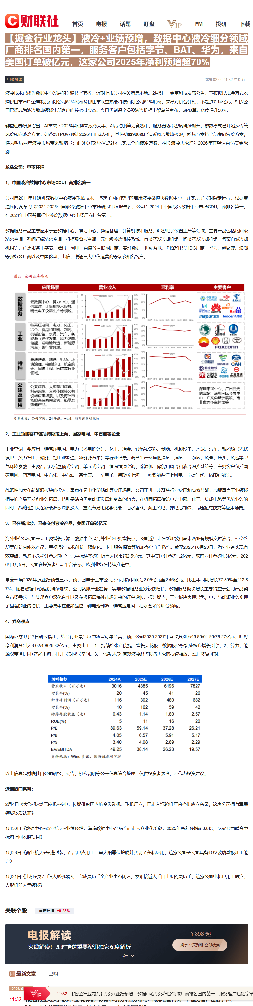 arrow-up11arrow-down1image11:32【掘金行业龙头】液冷+业绩预增,数据中心液冷细分领域厂商排名国内第一,服务客户包括字节、BAT、华为,来自美国订单破亿元,这家公司2025年净利预增超70%CLSMA to 财联社 10合一 实时滚动更新中文 · 15 hours agomessage-square0linkfedilink