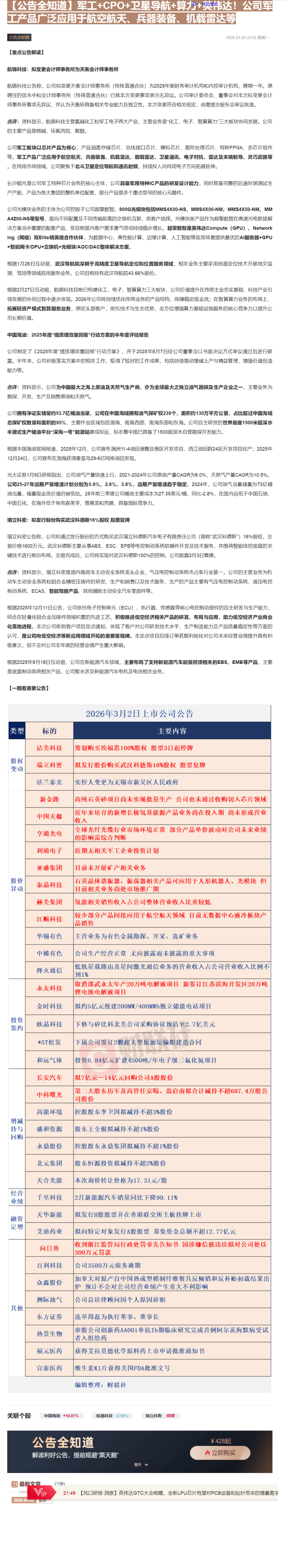 CLSMA to 财联社 10合一 实时滚动更新中文 · 2 hours ago22:05【公告全知道】军工+CPO+卫星导航+算力+英伟达!公司军工产品广泛应用于航空航天、兵器装备、机载雷达等imagemessage-square0linkfedilinkarrow-up11arrow-down10