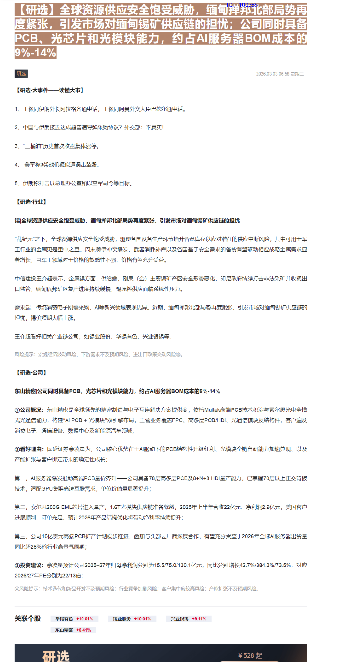 arrow-up11arrow-down1image06:58【研选】全球资源供应安全饱受威胁,缅甸掸邦北部局势再度紧张,引发市场对缅甸锡矿供应链的担忧;公司同时具备PCB、光芯片和光模块能力,约占AI服务器BOM成本的9%-14%CLSMA to 财联社 10合一 实时滚动更新中文 · 2 hours agomessage-square0linkfedilink