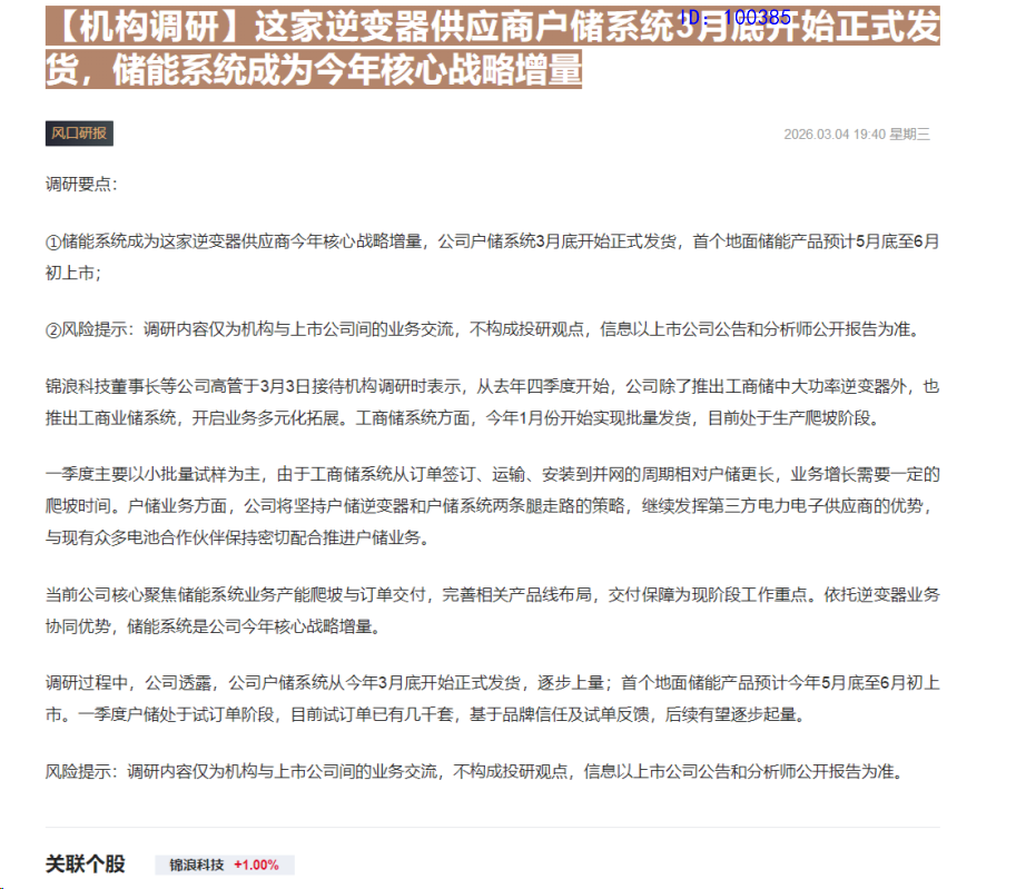 CLSMA to 财联社 10合一 实时滚动更新中文 · 9 hours ago19:40【机构调研】这家逆变器供应商户储系统3月底开始正式发货,储能系统成为今年核心战略增量imagemessage-square0linkfedilinkarrow-up11arrow-down10