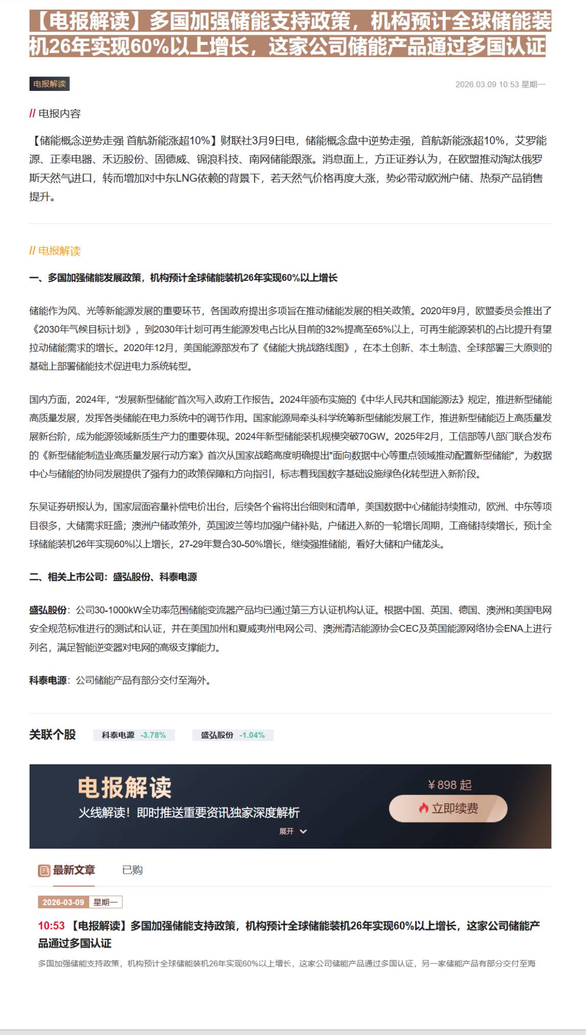 CLSMA to 财联社 10合一 实时滚动更新中文 · 8 hours ago10:53【电报解读】多国加强储能支持政策,机构预计全球储能装机26年实现60%以上增长,这家公司储能产品通过多国认证imagemessage-square0linkfedilinkarrow-up11arrow-down10