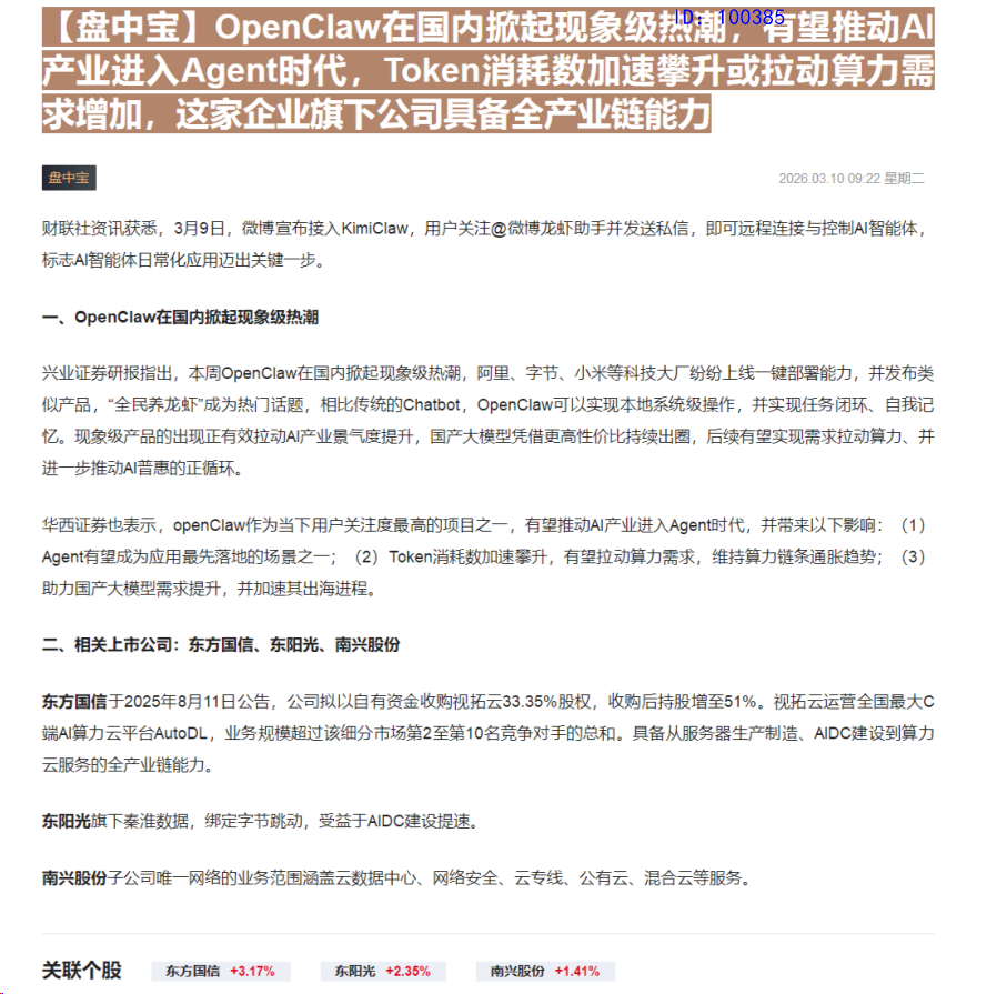 09:22【盘中宝】OpenClaw在国内掀起现象级热潮,有望推动AI产业进入Agent时代,Token消耗数加速攀升或拉动算力需求增加,这家企业旗下公司具备全产业链能力