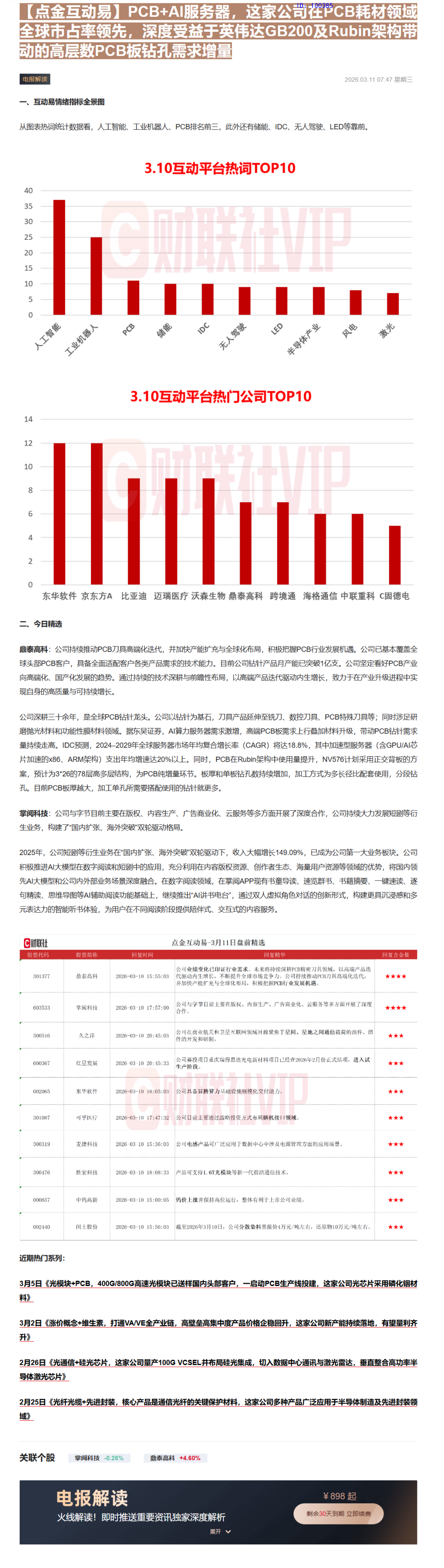 CLSMA to 财联社 10合一 实时滚动更新中文 · 10 hours ago07:47【点金互动易】PCB+AI服务器,这家公司在PCB耗材领域全球市占率领先,深度受益于英伟达GB200及Rubin架构带动的高层数PCB板钻孔需求增量imagemessage-square0linkfedilinkarrow-up11arrow-down10