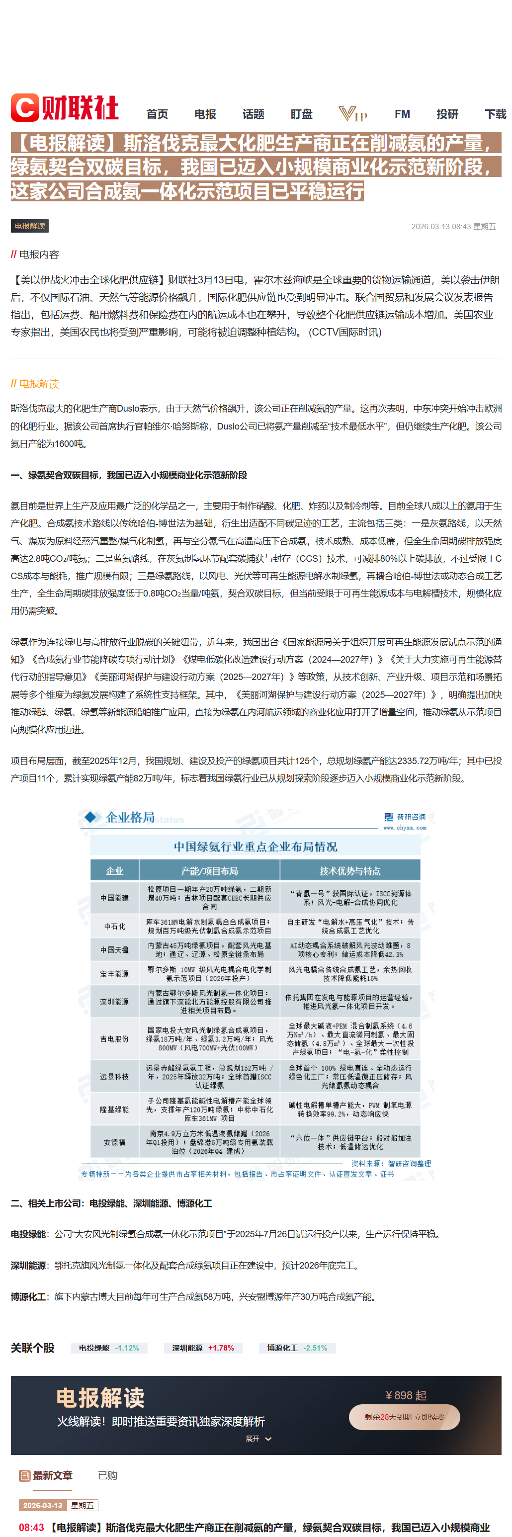 08:43【电报解读】斯洛伐克最大化肥生产商正在削减氨的产量,绿氨契合双碳目标,我国已迈入小规模商业化示范新阶段,这家公司合成氨一体化示范项目已平稳运行