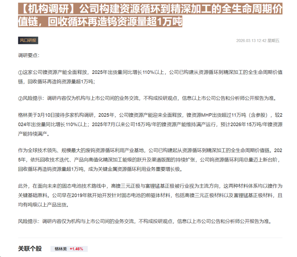 CLSMA to 财联社 10合一 实时滚动更新中文 · 7 hours ago12:42【机构调研】公司构建资源循环到精深加工的全生命周期价值链,回收循环再造钨资源量超1万吨imagemessage-square0linkfedilinkarrow-up11arrow-down10