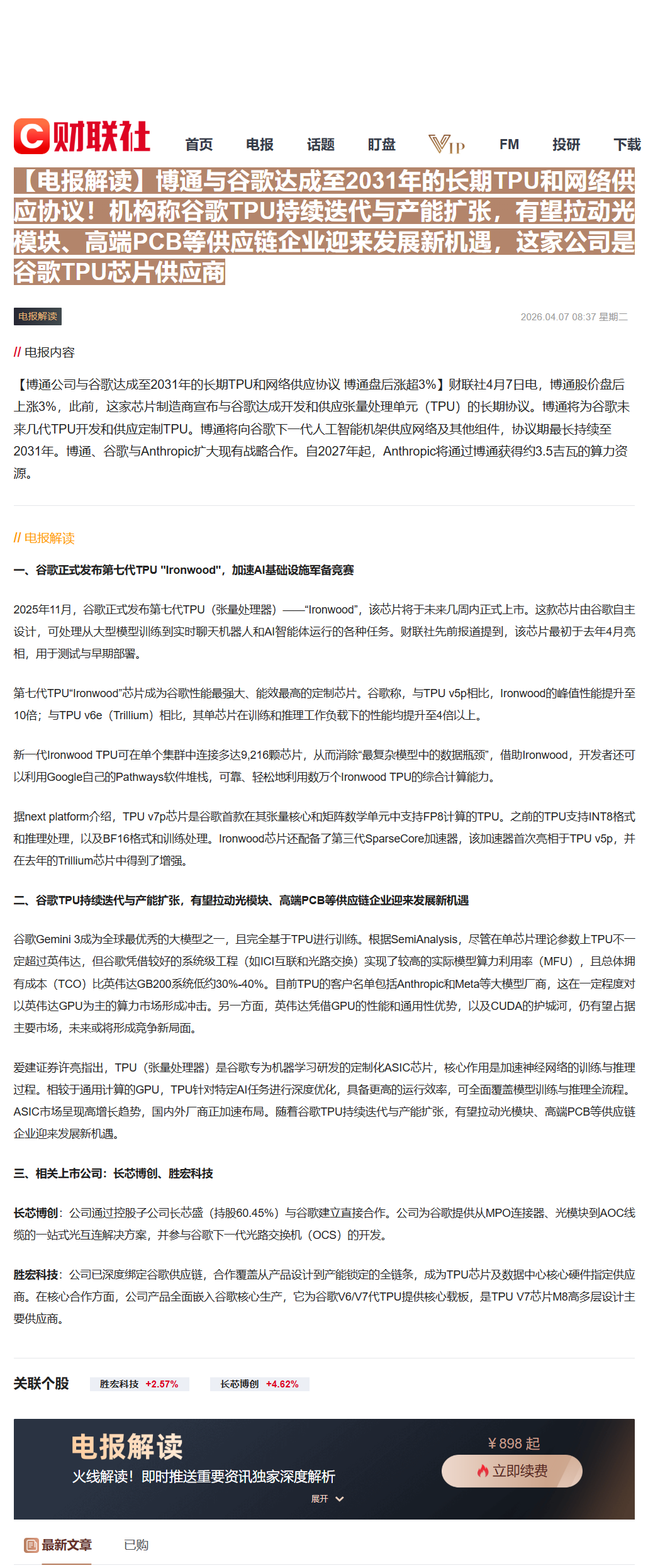 CLSMA to 财联社 10合一 实时滚动更新中文 · 7 hours ago08:37【电报解读】博通与谷歌达成至2031年的长期TPU和网络供应协议!机构称谷歌TPU持续迭代与产能扩张,有望拉动光模块、高端PCB等供应链企业迎来发展新机遇,这家公司是谷歌TPU芯片供应商imagemessage-square0linkfedilinkarrow-up11arrow-down10