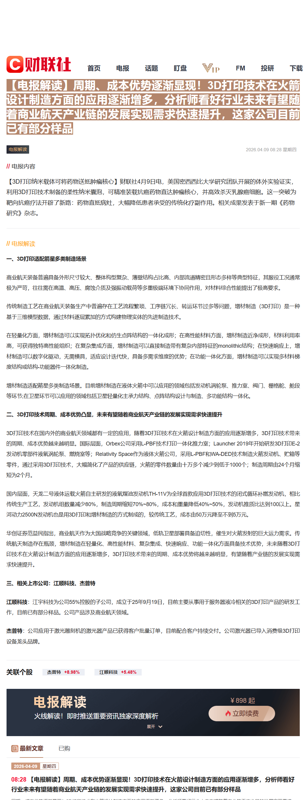 CLSMA to 财联社 10合一 实时滚动更新中文 · 4 hours ago08:28【电报解读】周期、成本优势逐渐显现!3D打印技术在火箭设计制造方面的应用逐渐增多,分析师看好行业未来有望随着商业航天产业链的发展实现需求快速提升,这家公司目前已有部分样品imagemessage-square0linkfedilinkarrow-up11arrow-down10