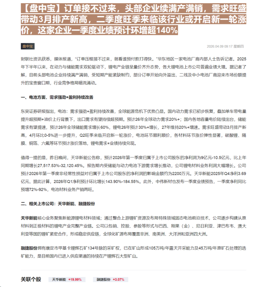 CLSMA to 财联社 10合一 实时滚动更新中文 · 3 hours ago09:17【盘中宝】订单接不过来,头部企业续满产满销,需求旺盛带动3月排产新高,二季度旺季来临该行业或开启新一轮涨价,这家企业一季度业绩预计环增超140%imagemessage-square0linkfedilinkarrow-up11arrow-down10