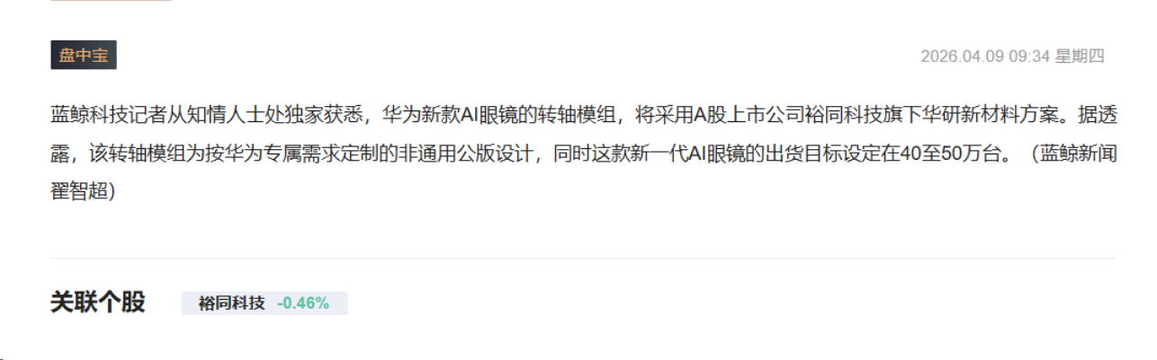 CLSMA to 财联社 10合一 实时滚动更新中文 · 2 hours ago09:34【盘中宝·独家】华为新款AI眼镜转轴模组采用这家公司新材料方案imagemessage-square0linkfedilinkarrow-up11arrow-down10