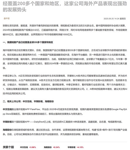 CLSMA to 财联社 10合一 实时滚动更新中文 · 25 days ago14:24【盘中宝】全球数字内容领域的新增长点,我国相关产品已经覆盖200多个国家和地区,这家公司海外产品表现出强劲的发展势头imagemessage-square0linkfedilinkarrow-up11arrow-down10