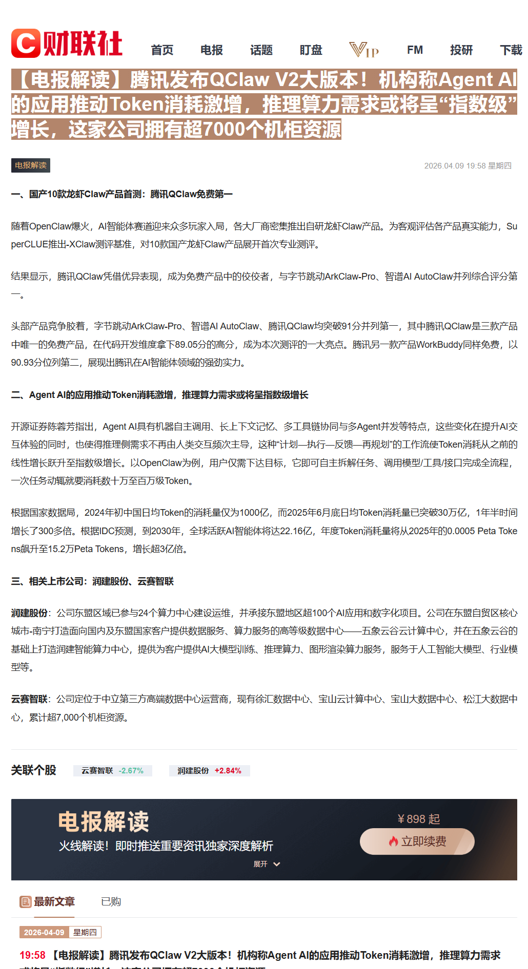 arrow-up11arrow-down1image19:58【电报解读】腾讯发布QClaw V2大版本!机构称Agent AI的应用推动Token消耗激增,推理算力需求或将呈“指数级”增长,这家公司拥有超7000个机柜资源CLSMA to 财联社 10合一 实时滚动更新中文 · 2 hours agomessage-square0linkfedilink