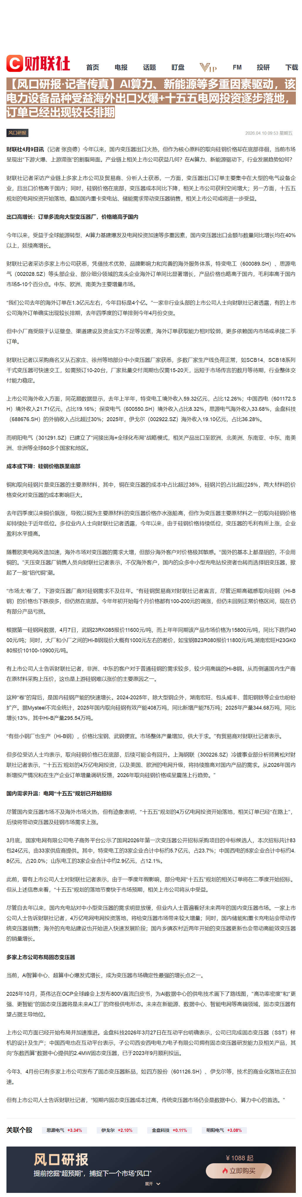 CLSMA to 财联社 10合一 实时滚动更新中文 · 5 hours ago09:53【风口研报·记者传真】AI算力、新能源等多重因素驱动,该电力设备品种受益海外出口火爆+十五五电网投资逐步落地,订单已经出现较长排期imagemessage-square0linkfedilinkarrow-up11arrow-down10