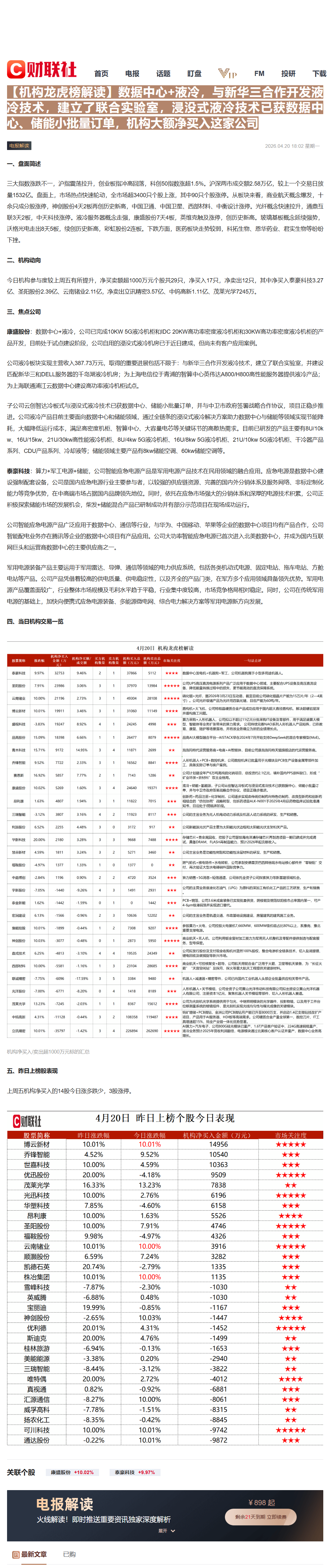 CLSMA to 财联社 10合一 实时滚动更新中文 · 2 hours ago18:02【机构龙虎榜解读】数据中心+液冷,与新华三合作开发液冷技术,建立了联合实验室,浸没式液冷技术已获数据中心、储能小批量订单,机构大额净买入这家公司imagemessage-square0linkfedilinkarrow-up11arrow-down10