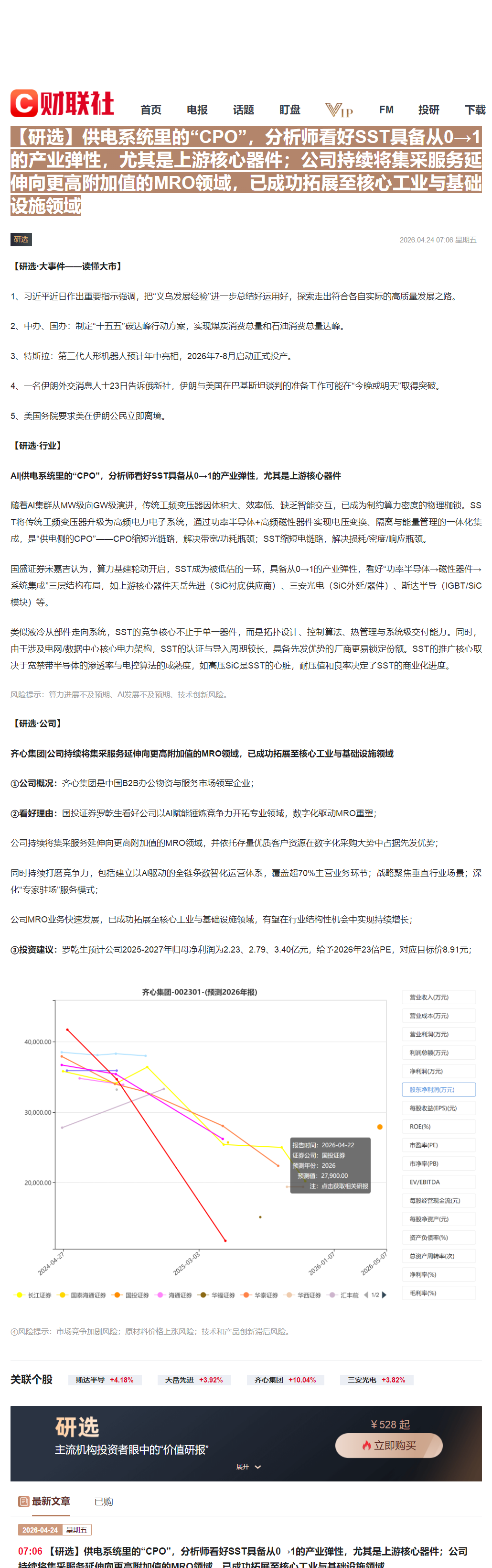 CLSMA to 财联社 10合一 实时滚动更新中文 · 7 hours ago07:06【研选】供电系统里的“CPO”,分析师看好SST具备从0→1的产业弹性,尤其是上游核心器件;公司持续将集采服务延伸向更高附加值的MRO领域,已成功拓展至核心工业与基础设施领域imagemessage-square0linkfedilinkarrow-up11arrow-down10