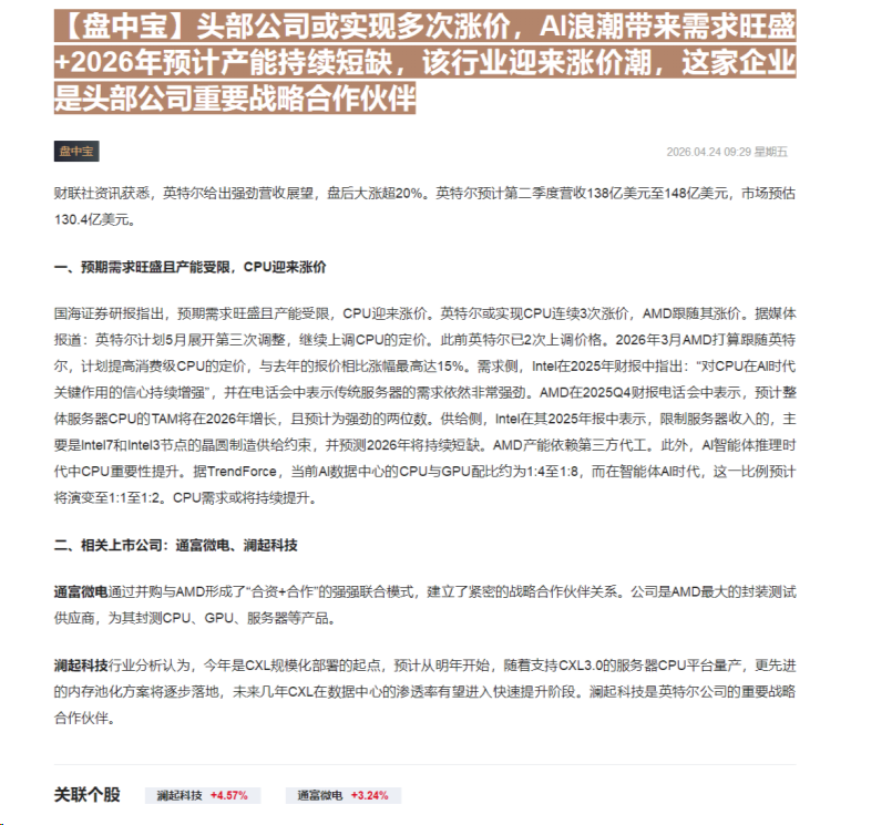 CLSMA to 财联社 10合一 实时滚动更新中文 · 6 hours ago09:29【盘中宝】头部公司或实现多次涨价,AI浪潮带来需求旺盛+2026年预计产能持续短缺,该行业迎来涨价潮,这家企业是头部公司重要战略合作伙伴imagemessage-square0linkfedilinkarrow-up11arrow-down10