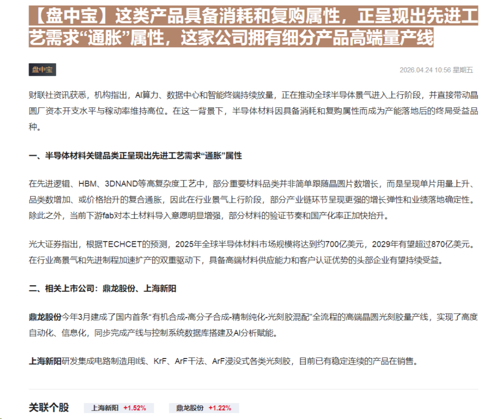 10:56【盘中宝】这类产品具备消耗和复购属性,正呈现出先进工艺需求“通胀”属性,这家公司拥有细分产品高端量产线