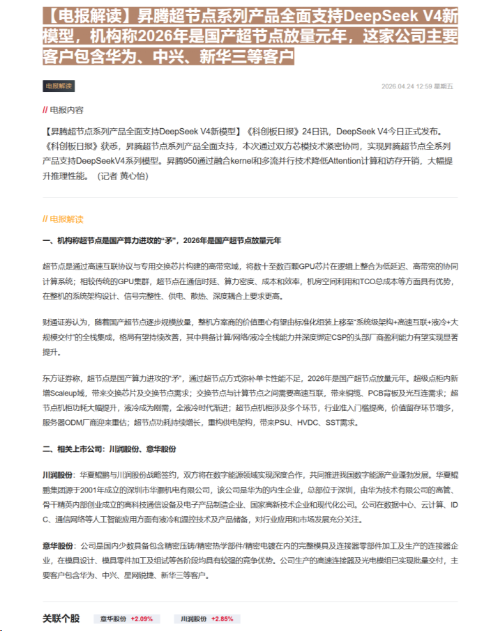 arrow-up11arrow-down1image12:59【电报解读】昇腾超节点系列产品全面支持DeepSeek V4新模型,机构称2026年是国产超节点放量元年,这家公司主要客户包含华为、中兴、新华三等客户CLSMA to 财联社 10合一 实时滚动更新中文 · 9 hours agomessage-square0linkfedilink